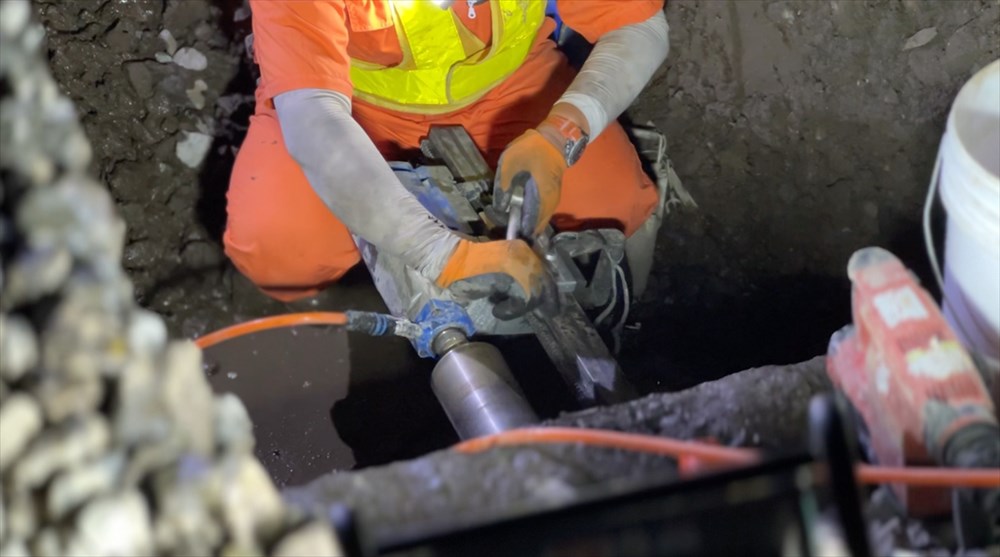 掘り進める中で状況に応じて、臨機応変に必要な工具をパッパと手に取り、スピーディーに管を通す穴が地下に作られていきました。プロフェッショナルの仕事です!